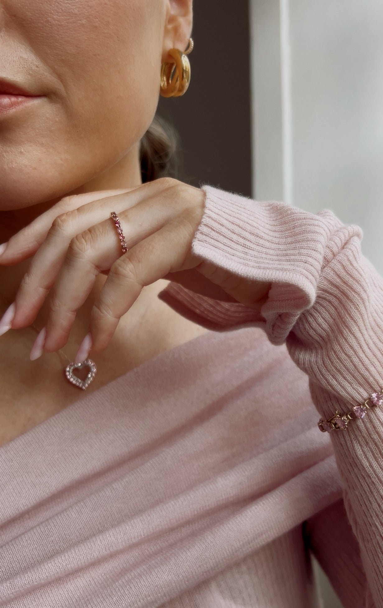 A very pretty 9ct gold ring with seven light and darker pink tourmalines.