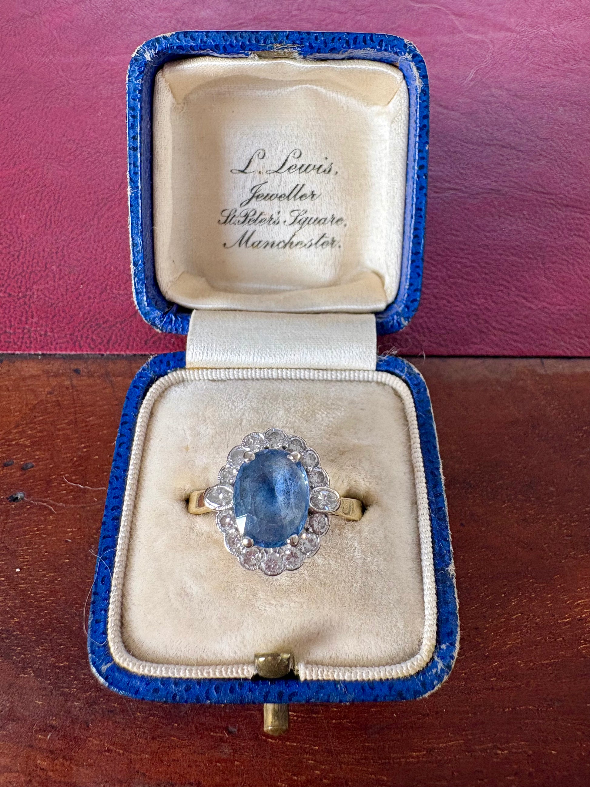 An absolutely gorgeous Edwardian 18ct gold, blue sapphire and diamond cluster ring. Full hallmark to interior of shank. The central oval blue sapphire is a beautiful colour and this is surrounded by sixteen small pave set diamonds of good colour and clarity. Estimated diamond weight is 0.50ct.