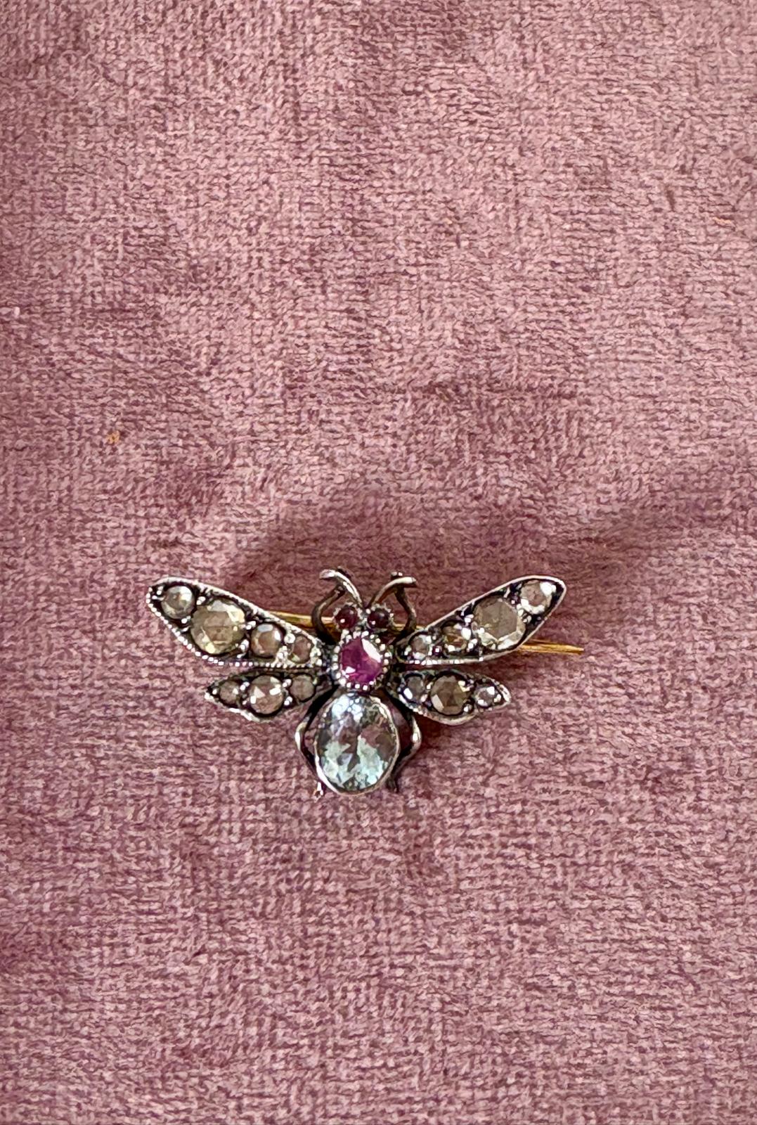Really very beautiful diamond, aquamarine and ruby winged insect brooch. Set with rose-cut diamonds, aquamarine and ruby.
