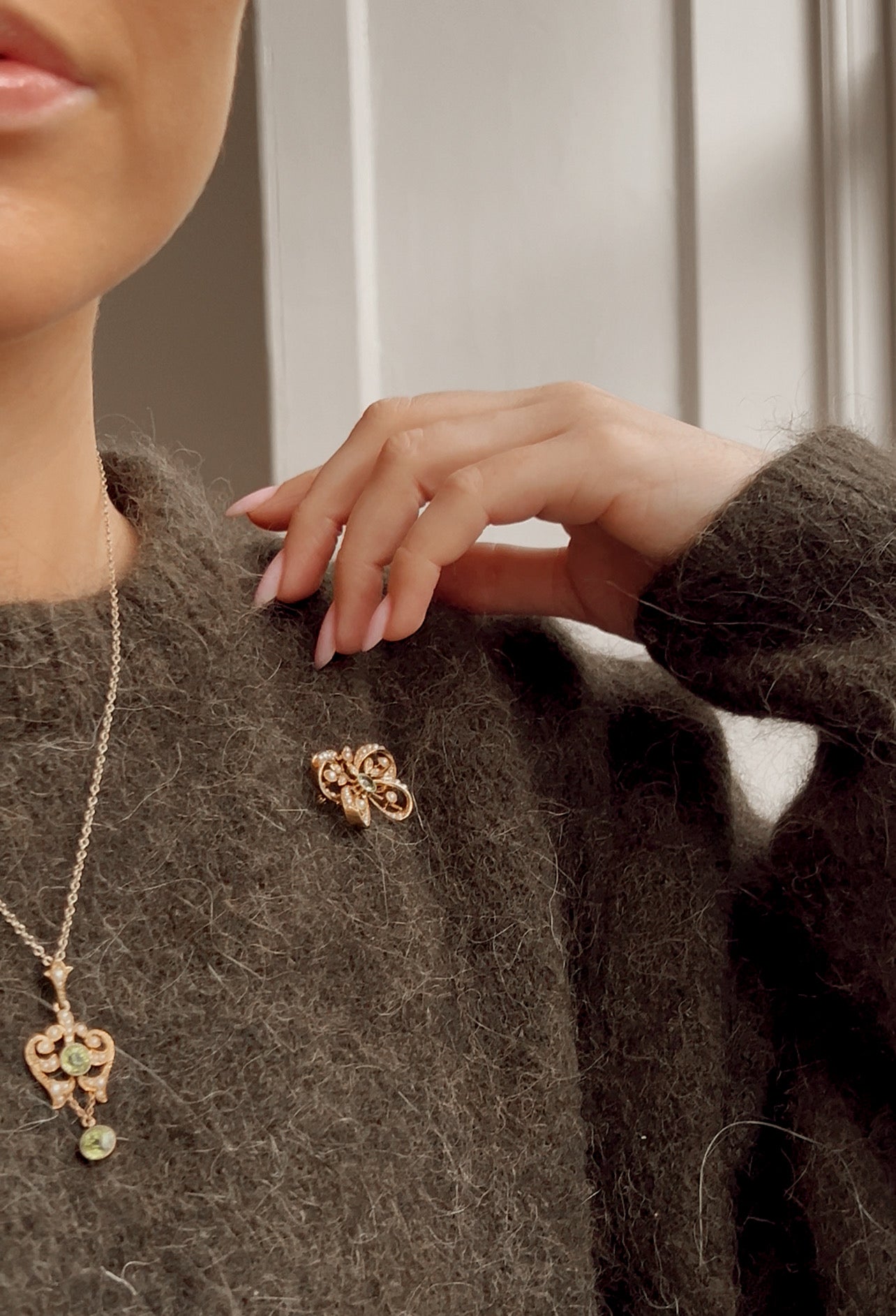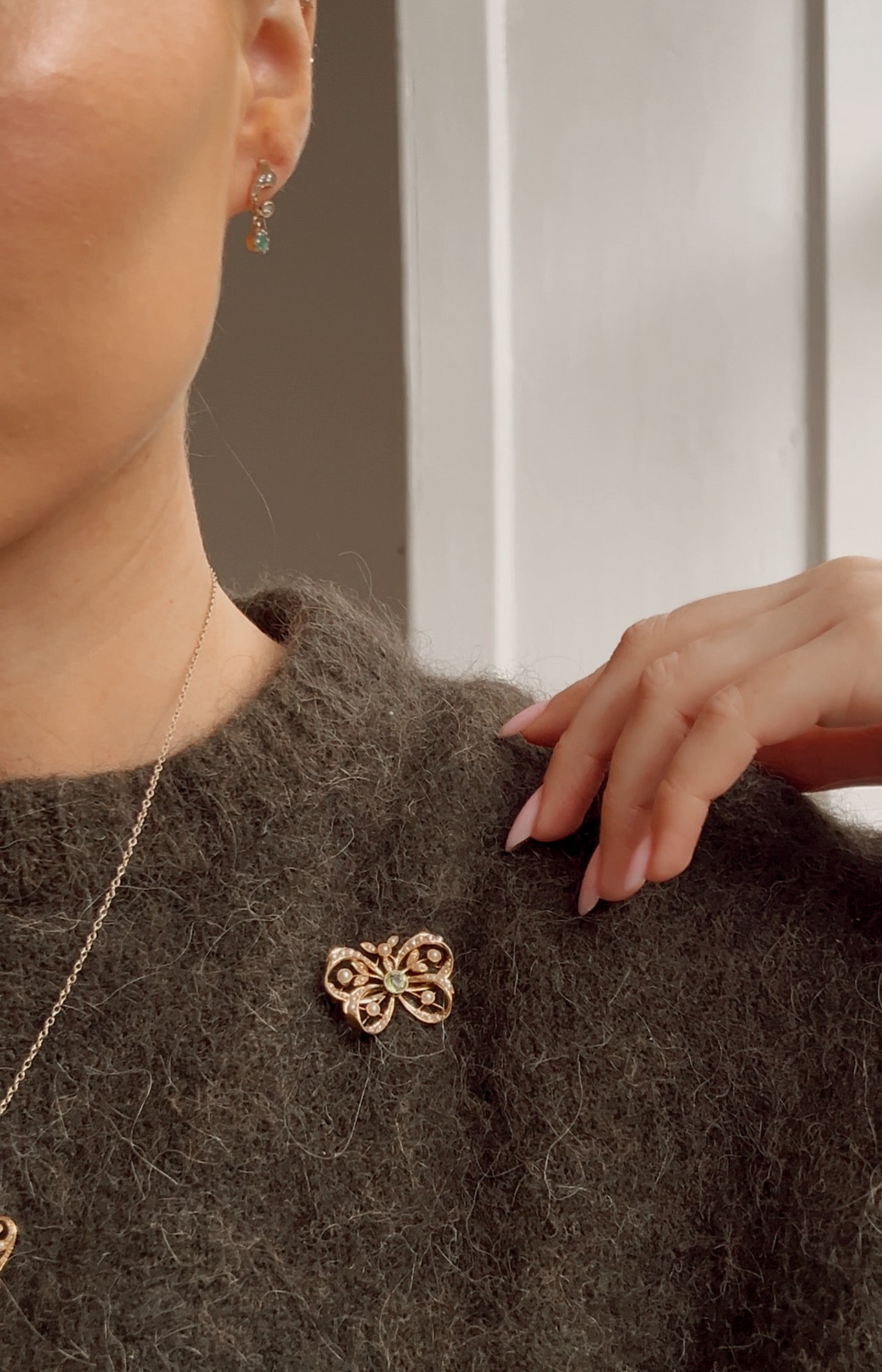 A beautiful early 20th Century gold, peridot and split pearl brooch.