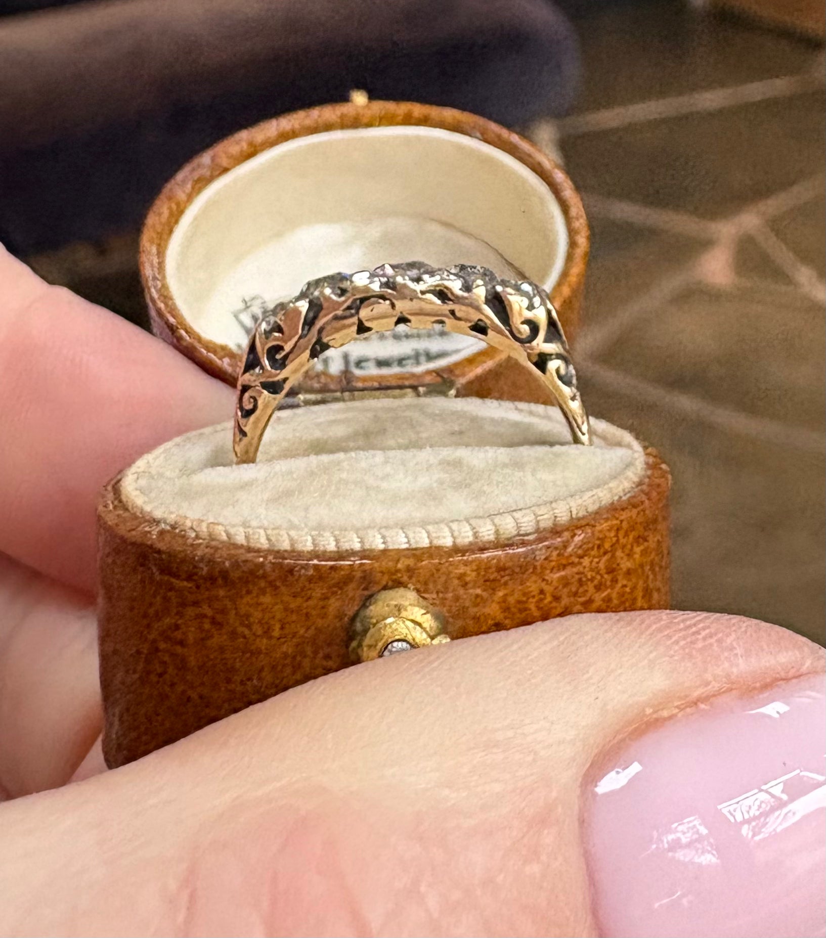 This is a fabulous 19th Century diamond five stone ring. Estimated total diamond weight 0.80ct. Five gorgeous old cut diamonds, wonderful sparkle from within. Tinted in colour, P1 clarity. Set in a scroll design.