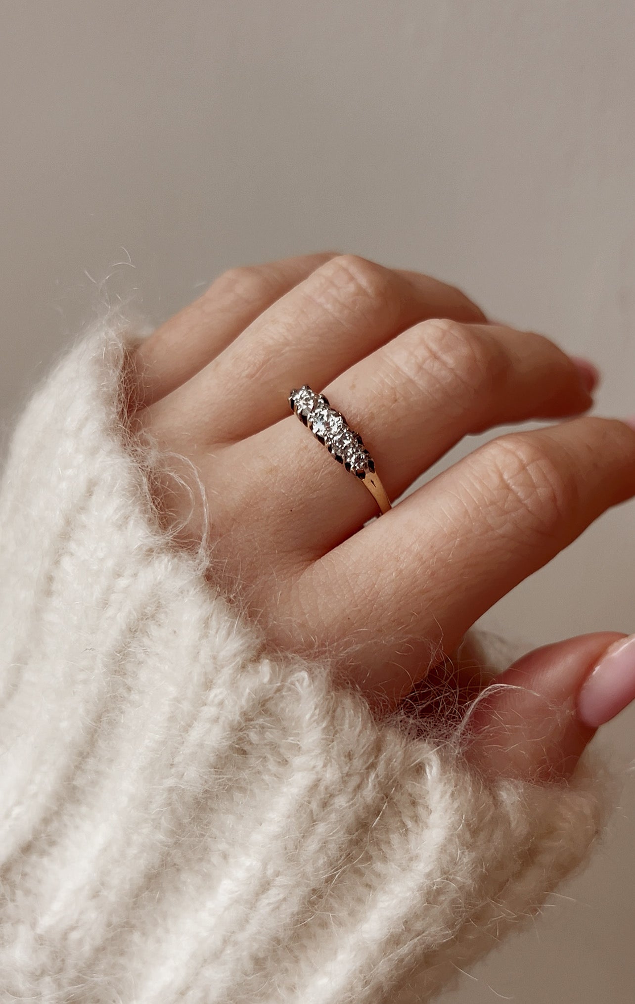 Gorgeous, characterful five stone ring with five lively, sparkly old cut diamonds. Stamped 18st PLAT. Early 20th Century. Estimated diamond total 0.6carat. Estimated diamond colour: I-J, SI2-P1