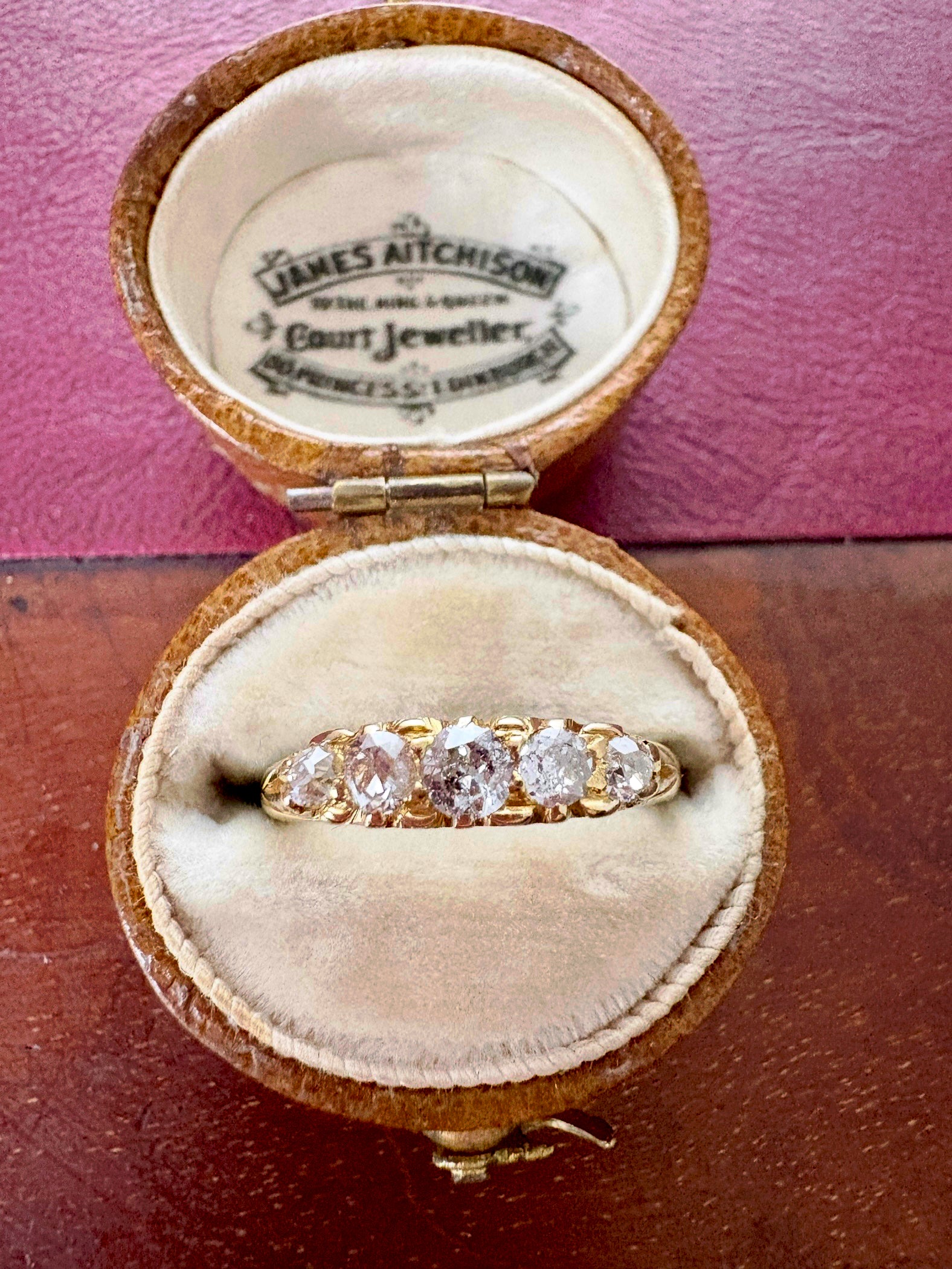 Pretty Edwardian five old cut diamond ring set in beautiful buttery 18ct gold with a very lovely scrollwork setting. The diamonds are bright and lively.