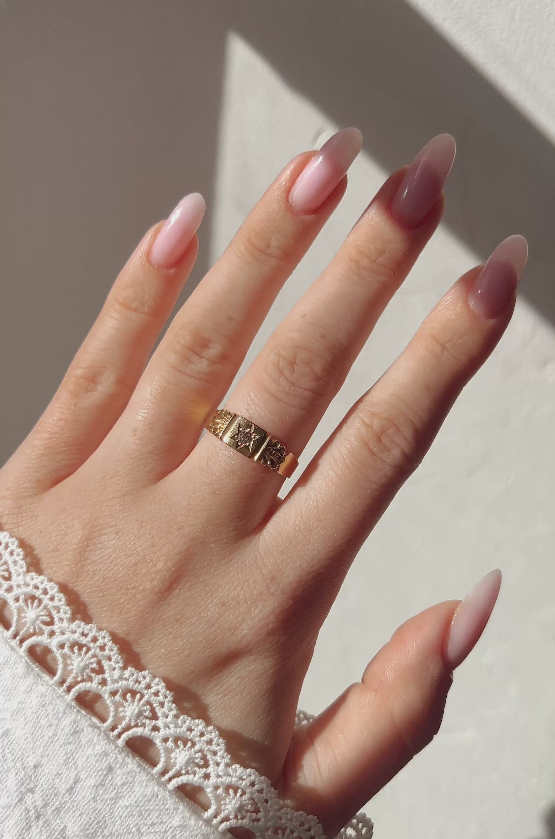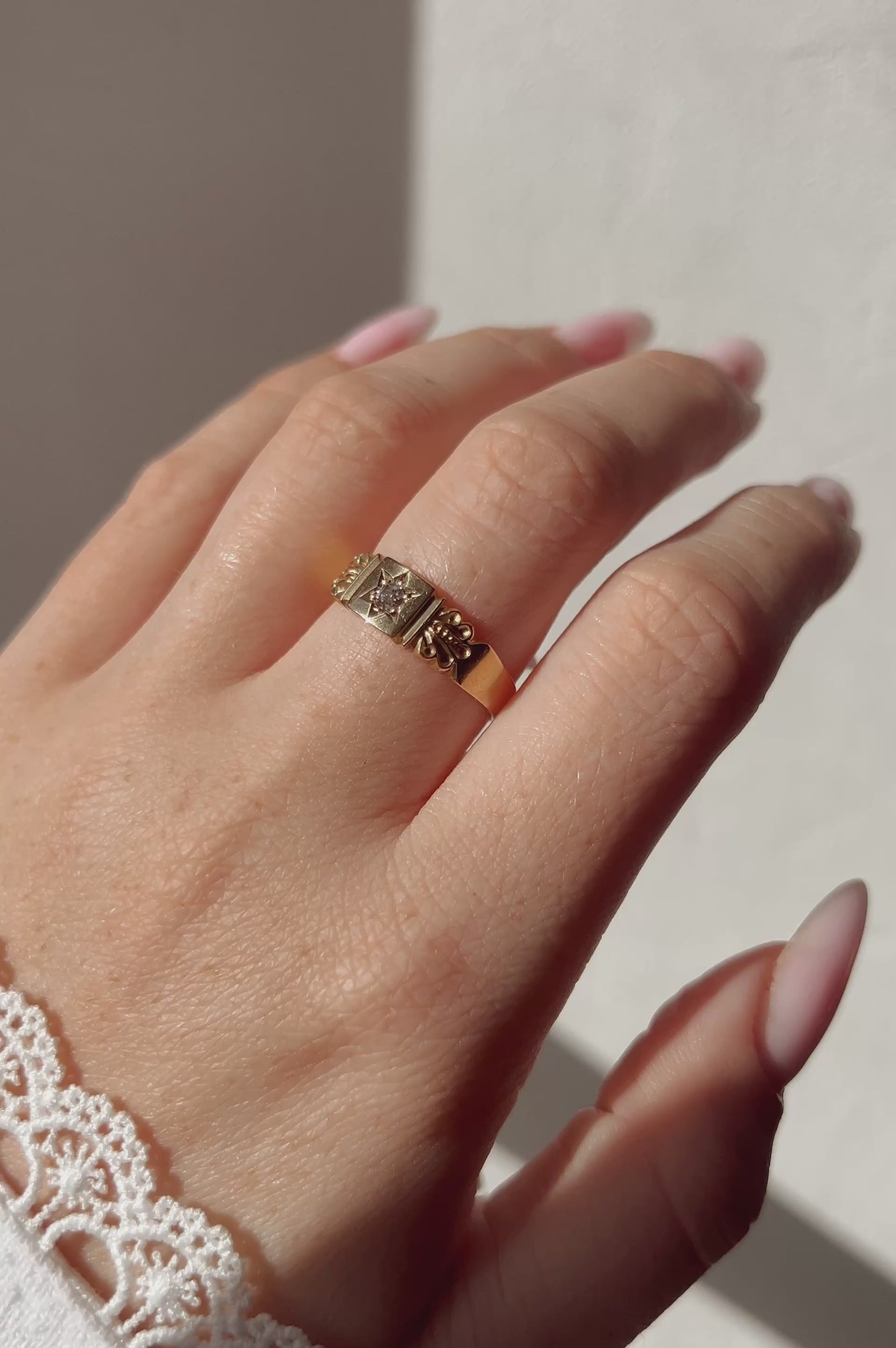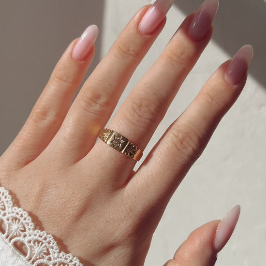 A very attractive Victorian 18ct gold Dimond ring, star and grain set to the centre with an old-cut diamond. Diamond approximately 0.05 to 0.06arat with scallop carved shoulder detail to plain band. UK Hallmarks, Chester, 1895.