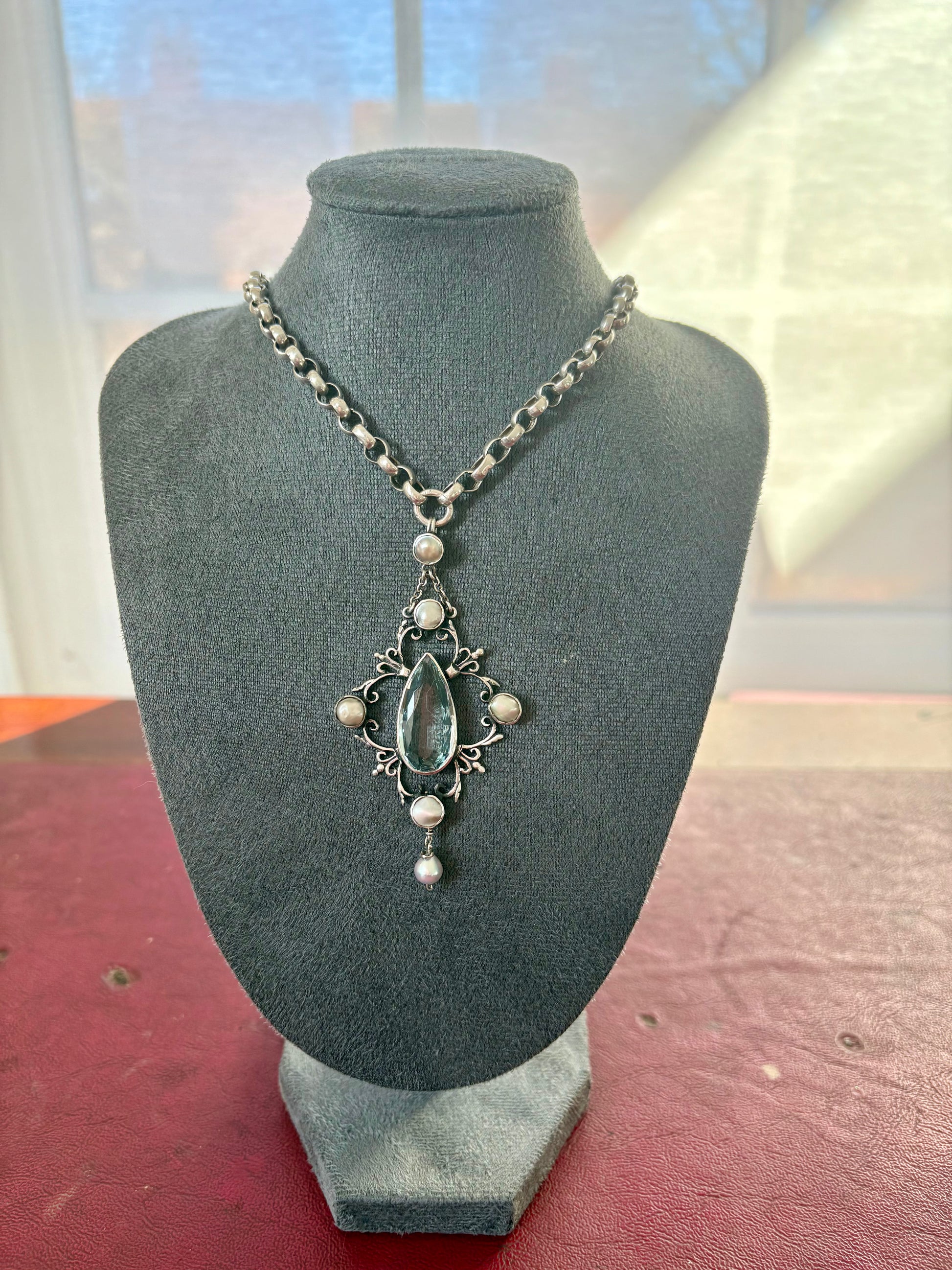A truly stunning piece of jewellery! Made in Edwardian England, a gorgeous aquamarine at its centre, surrounded by beautiful grey mother-of-pearls all encased in silver. A beautiful chunky silver necklace accompanies it. Chain clasp stamped silver.