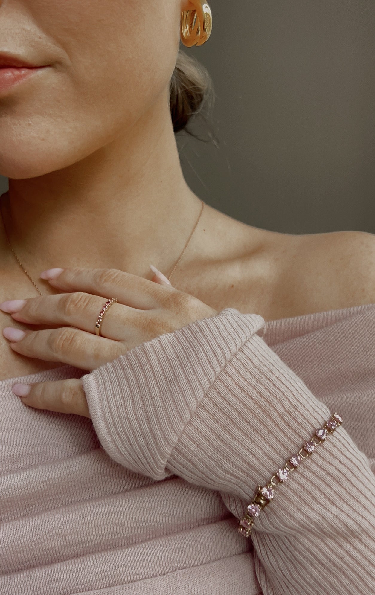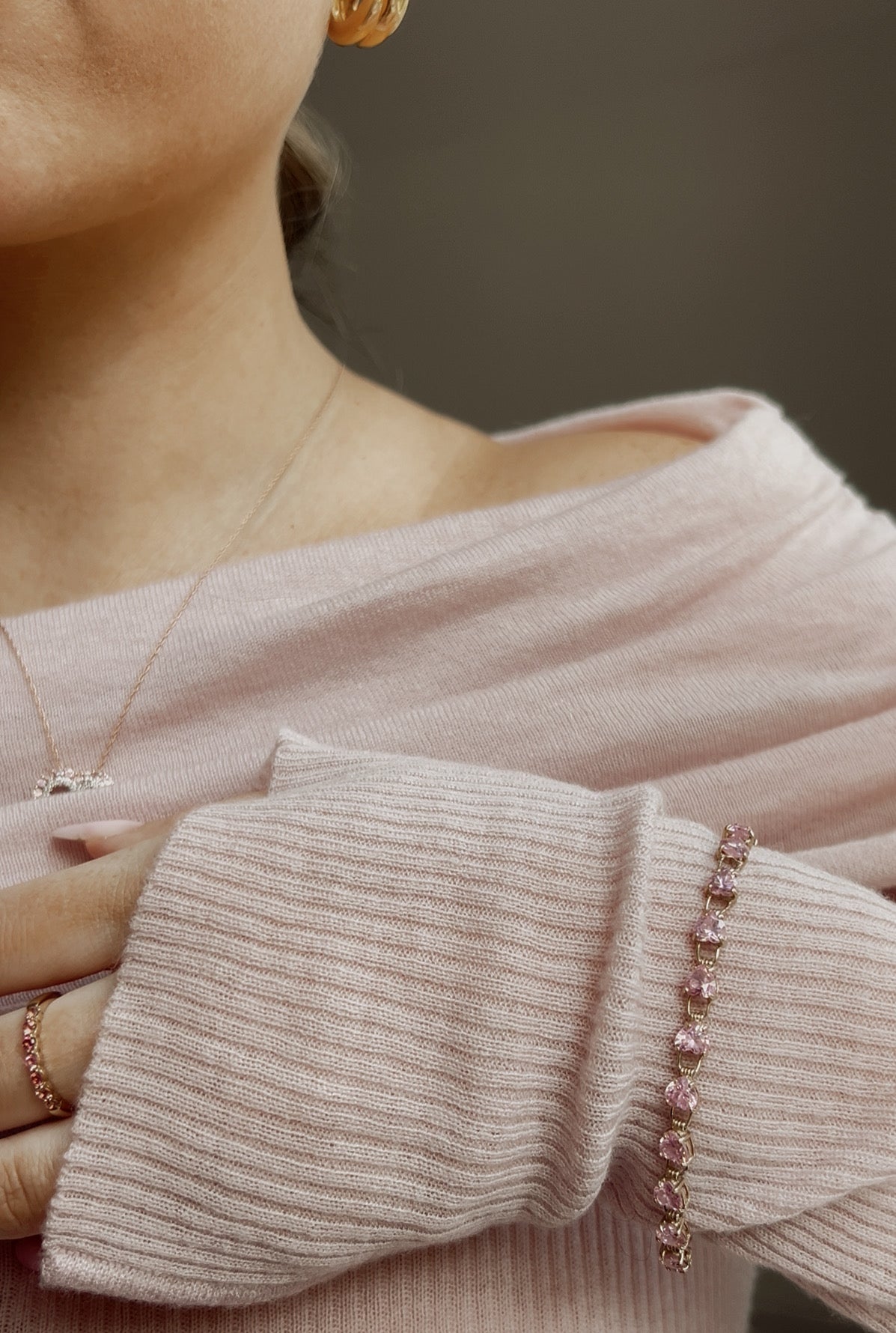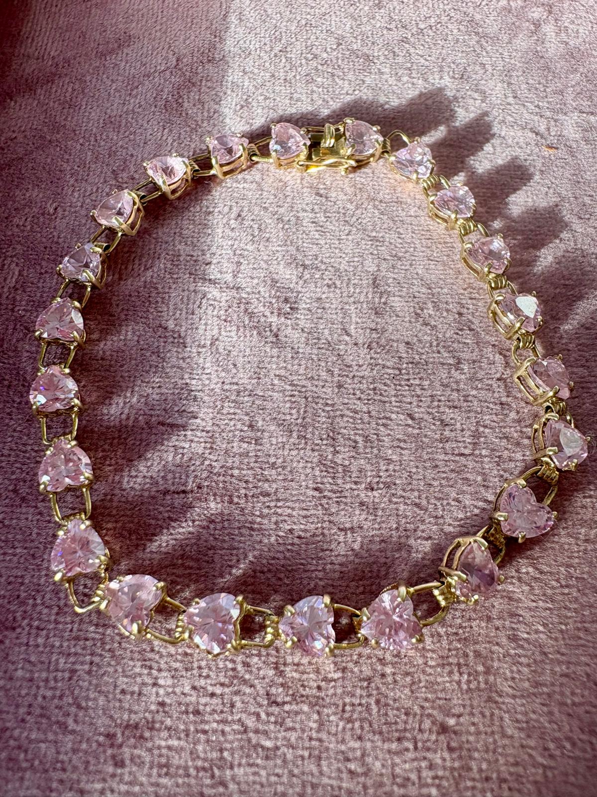 Absolutely stunning stamped 9ct gold and pink cubic zirconia heart bracelet with 22 beautiful light pink cubic zirconia hearts linked by 9ct gold. Date mark of T for 1993.