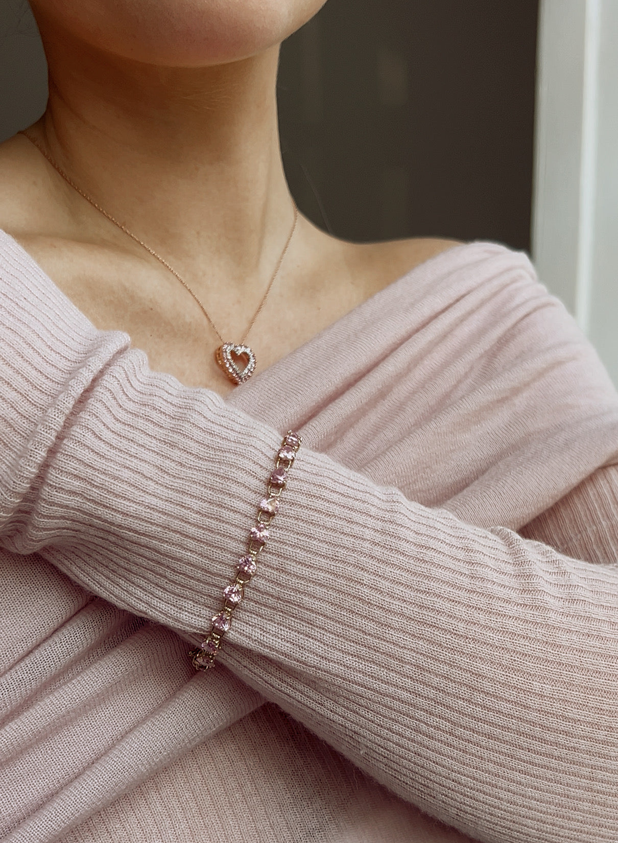 Stunning 9ct Gold and Pink Cubic Zirconia Heart Bracelet