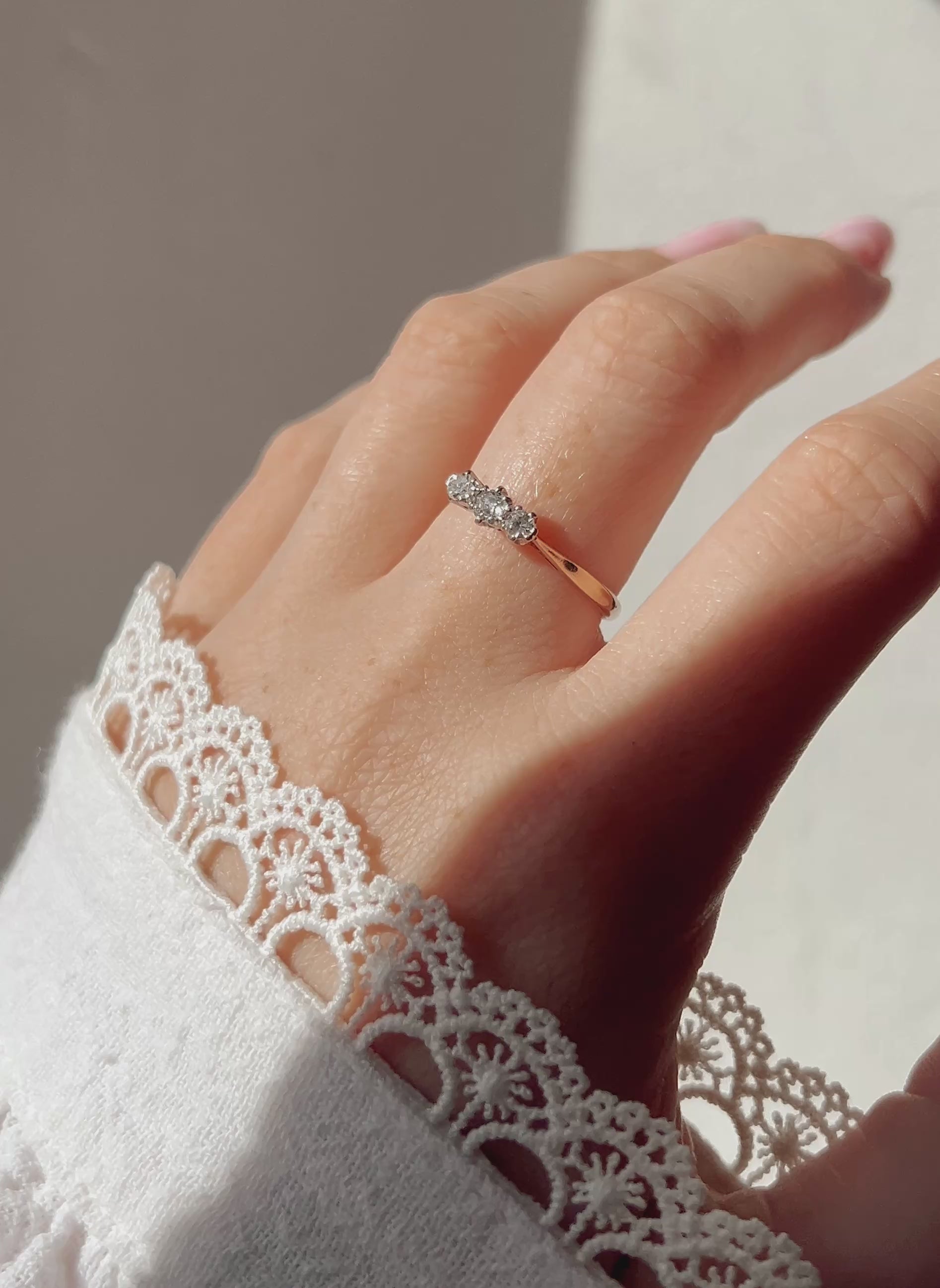 The sweetest three stone vintage old cut diamond ring. Set with three natural old cut diamonds totalling approximately 0.3ct, diamonds are G-H colour, VS-SI clarity. Set in platinum and 18ct rose gold. Stamped 'PLAT' 18ct.