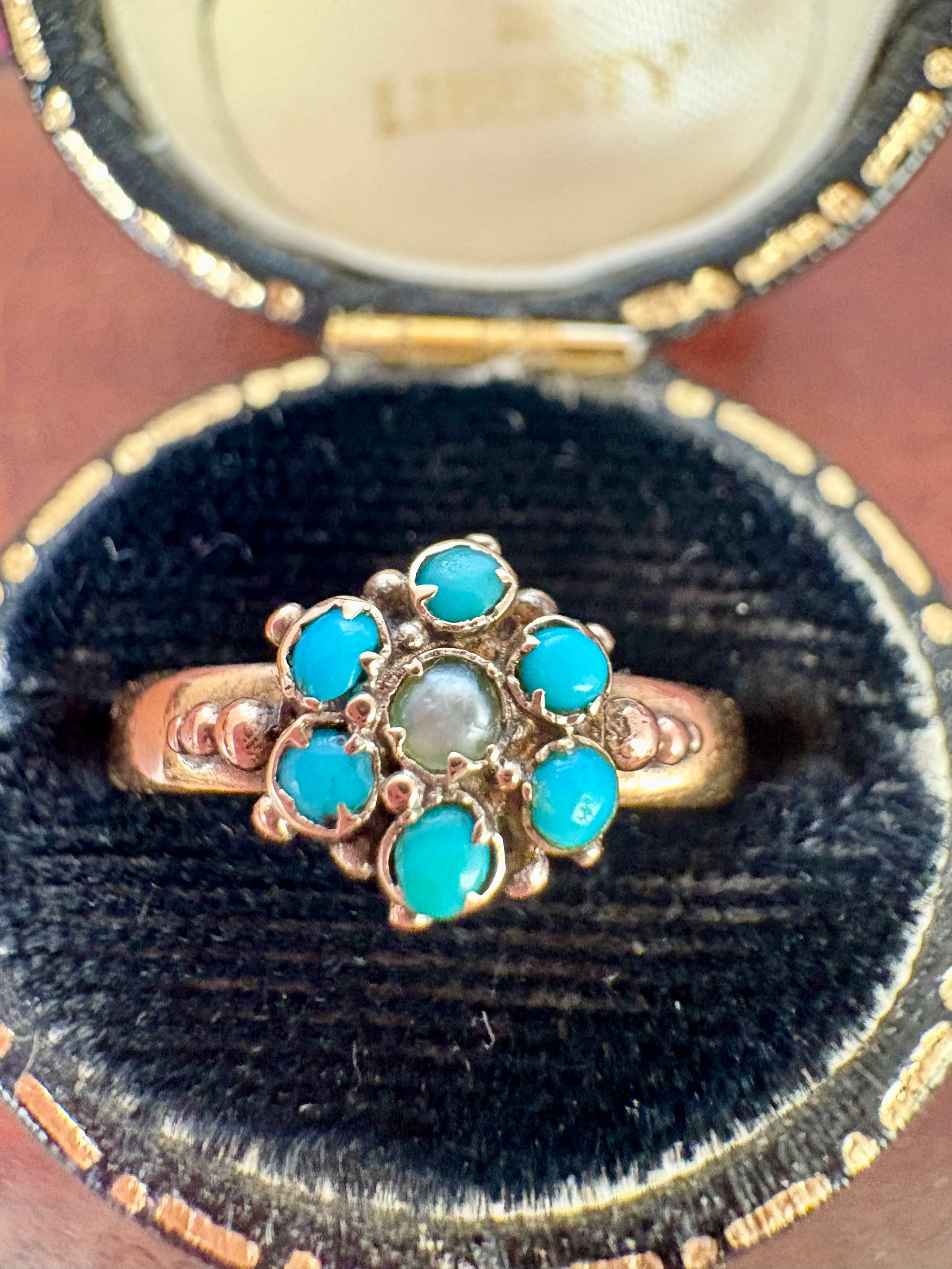 Lovely turquoise and split pearl ring. Band with hallmarks for Birmingham, 1873