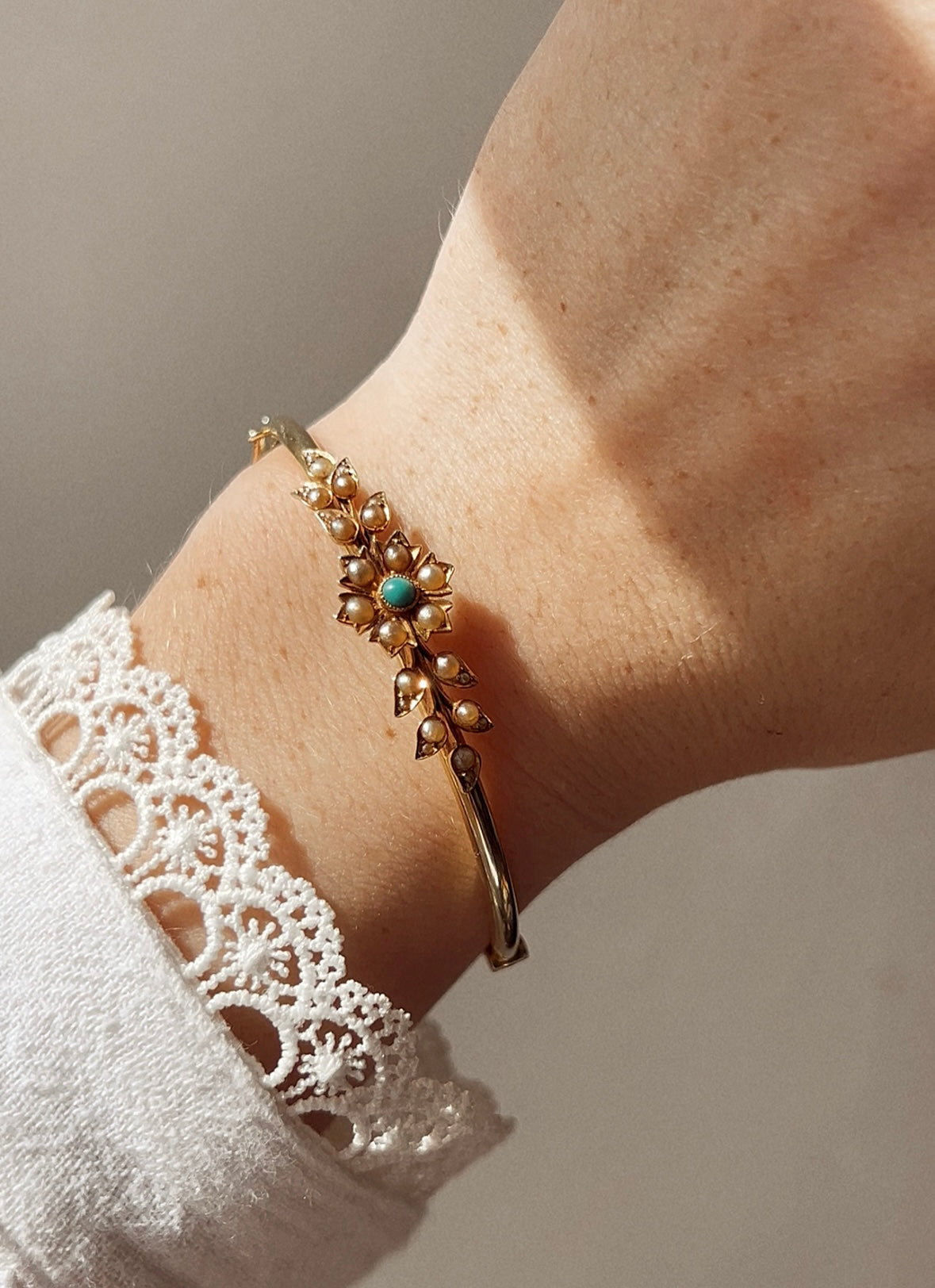 Early 20th Century 15ct Gold, Turquoise and Split Pearl Hinged Bracelet