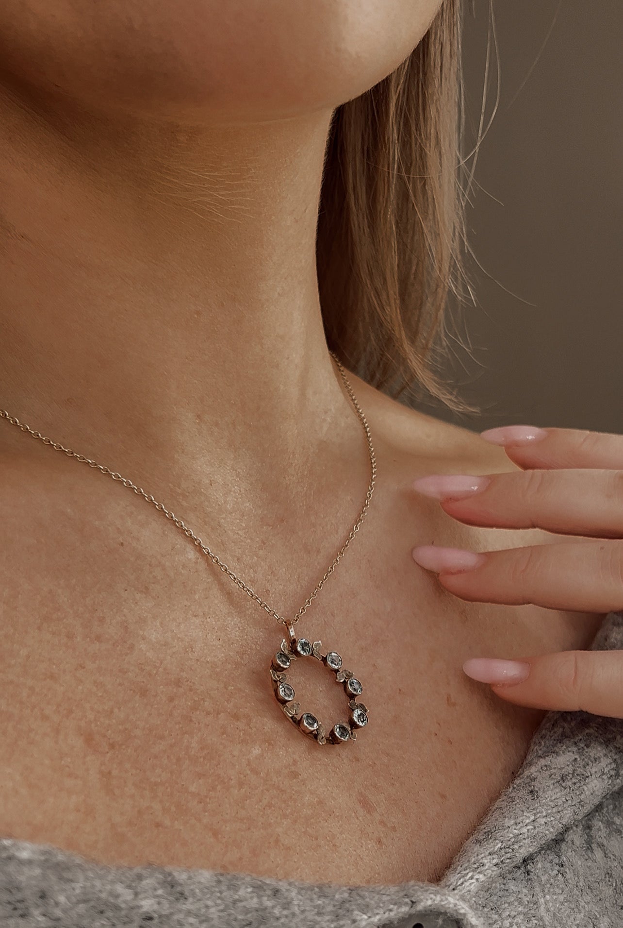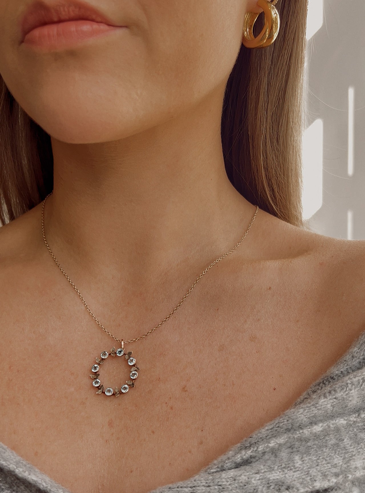 This is a very pretty and delicate 9ct gold foliate pendant with eight very pretty round aquamarines. Please note, this pendant DOES NOT come with the necklace in the photo.
