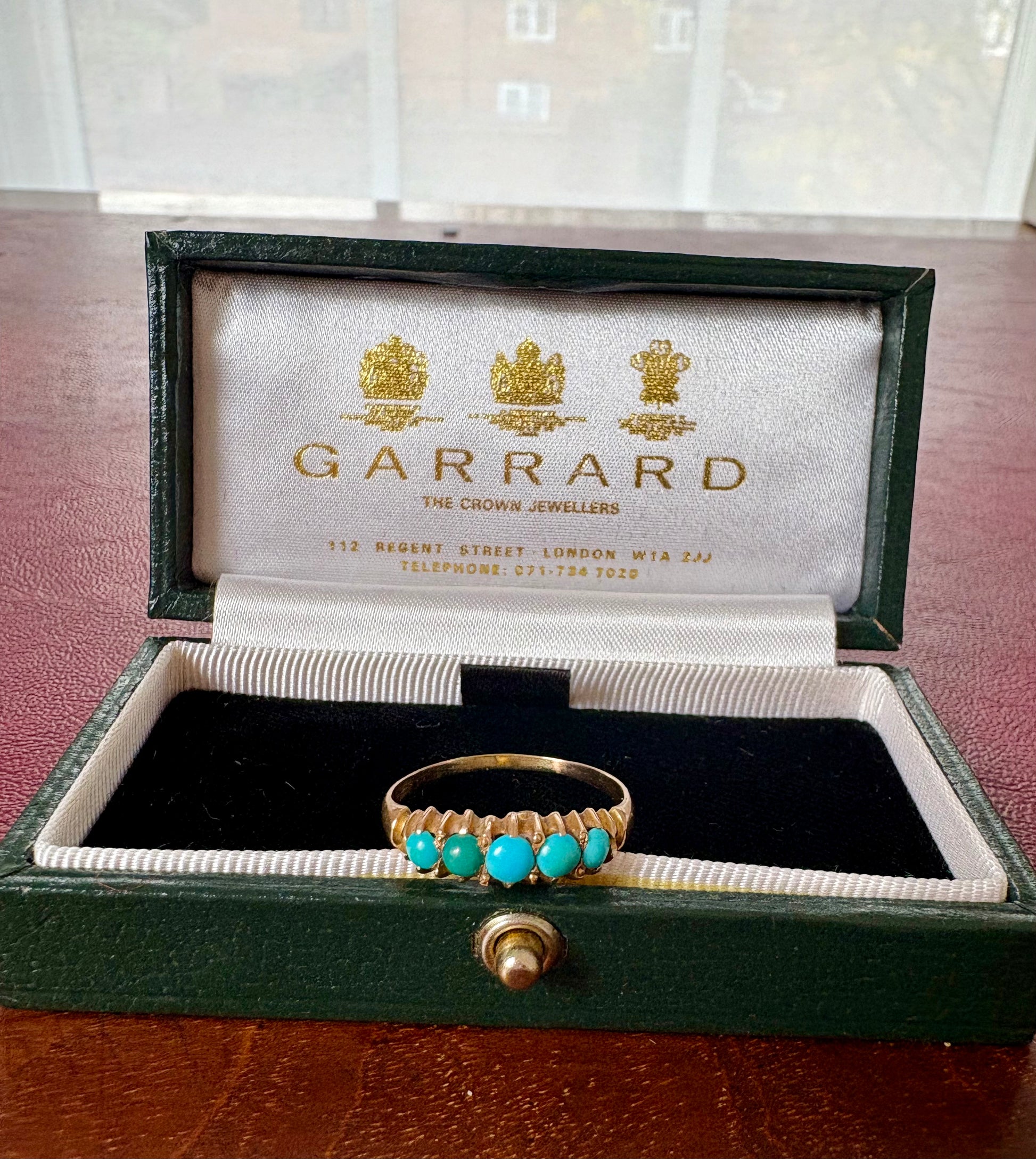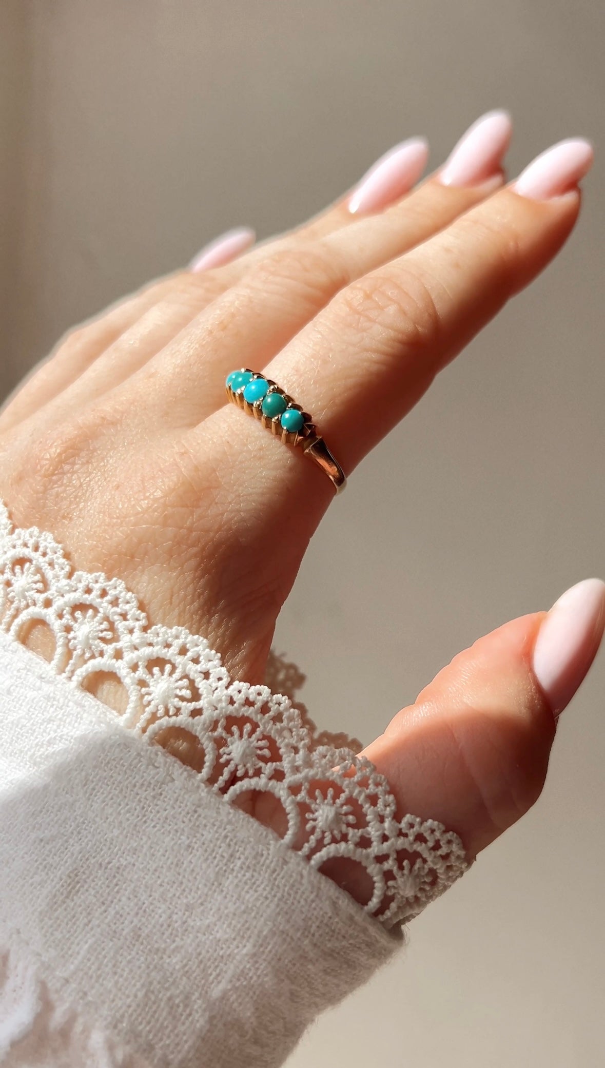 Very Attractive 20th Century turquoise and gold ring. The stones vary from bluish green to bright blue but I think this adds to its beauty! The combination of the bluish green stones and the buttery gold is delightful!