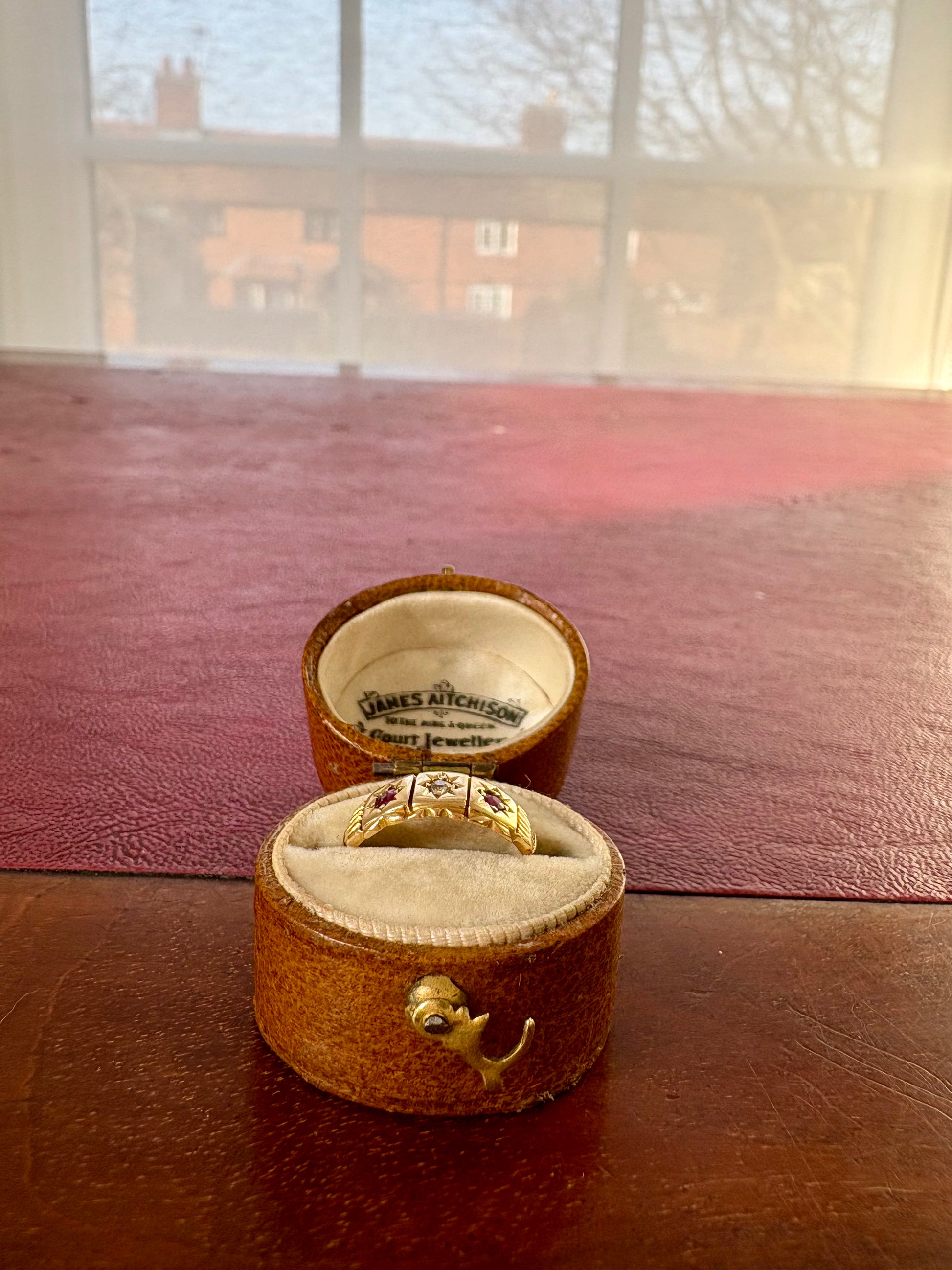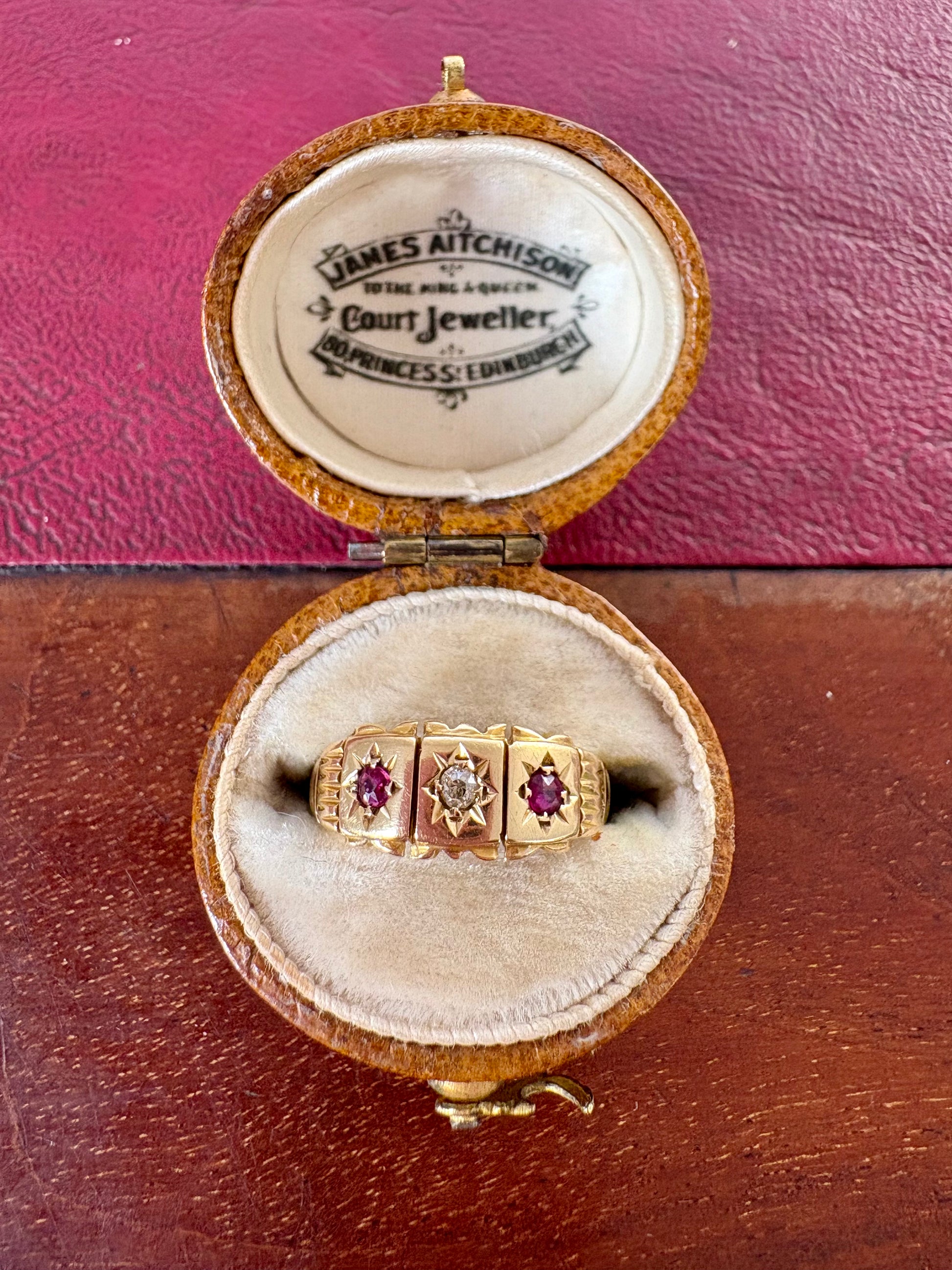A wonderful Edwardian 18ct gold, ruby and diamond ring. Set with an old-cut diamond and two gorgeous rubies. Hallmark for Chester, England, 1903. She's quite small so would make a marvellous pinkie ring!