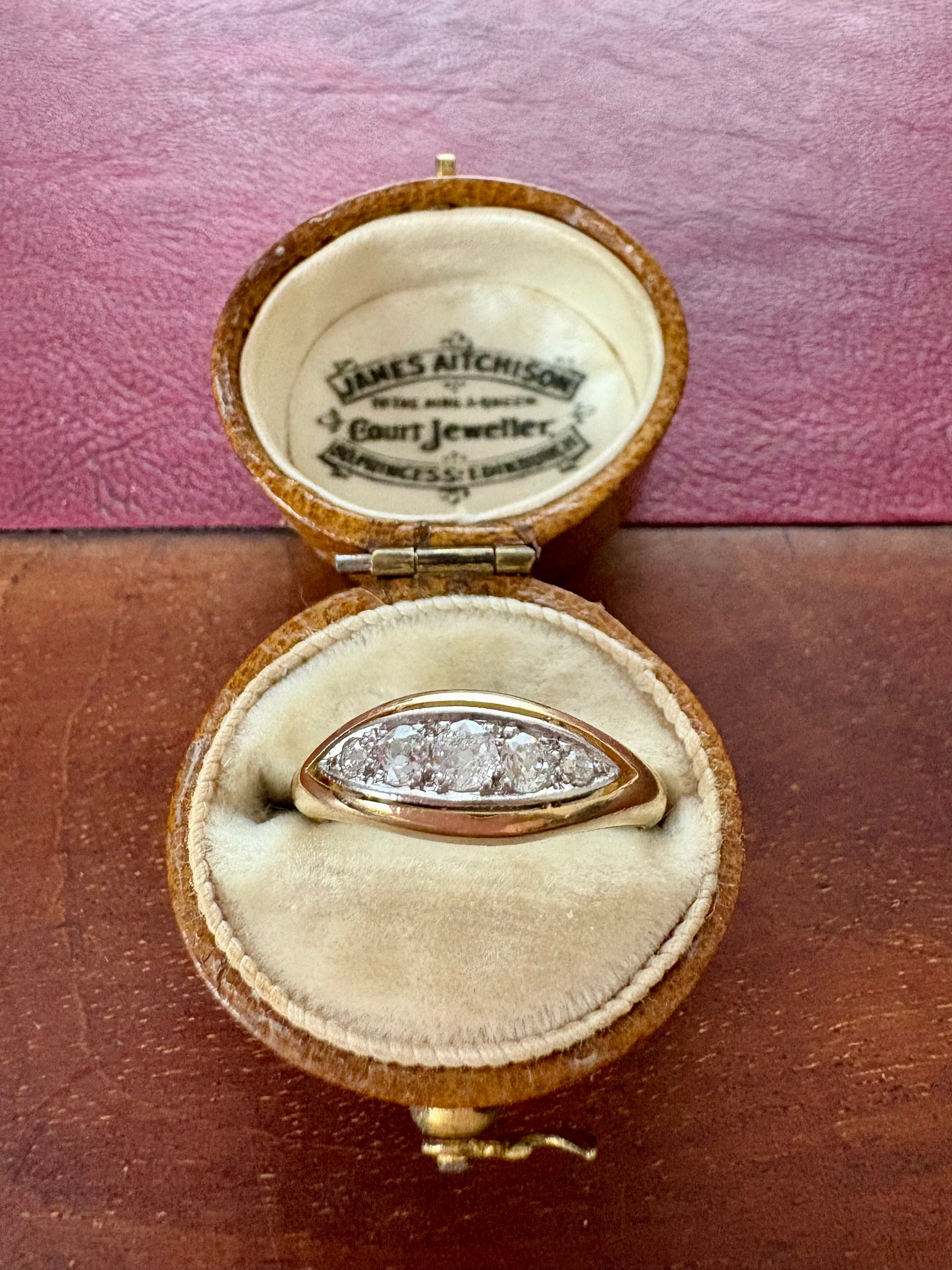 Condition: General light marks, wear and minor dents in keeping with general age and wear. Diamonds bright. Some file marks to the inside of the band.